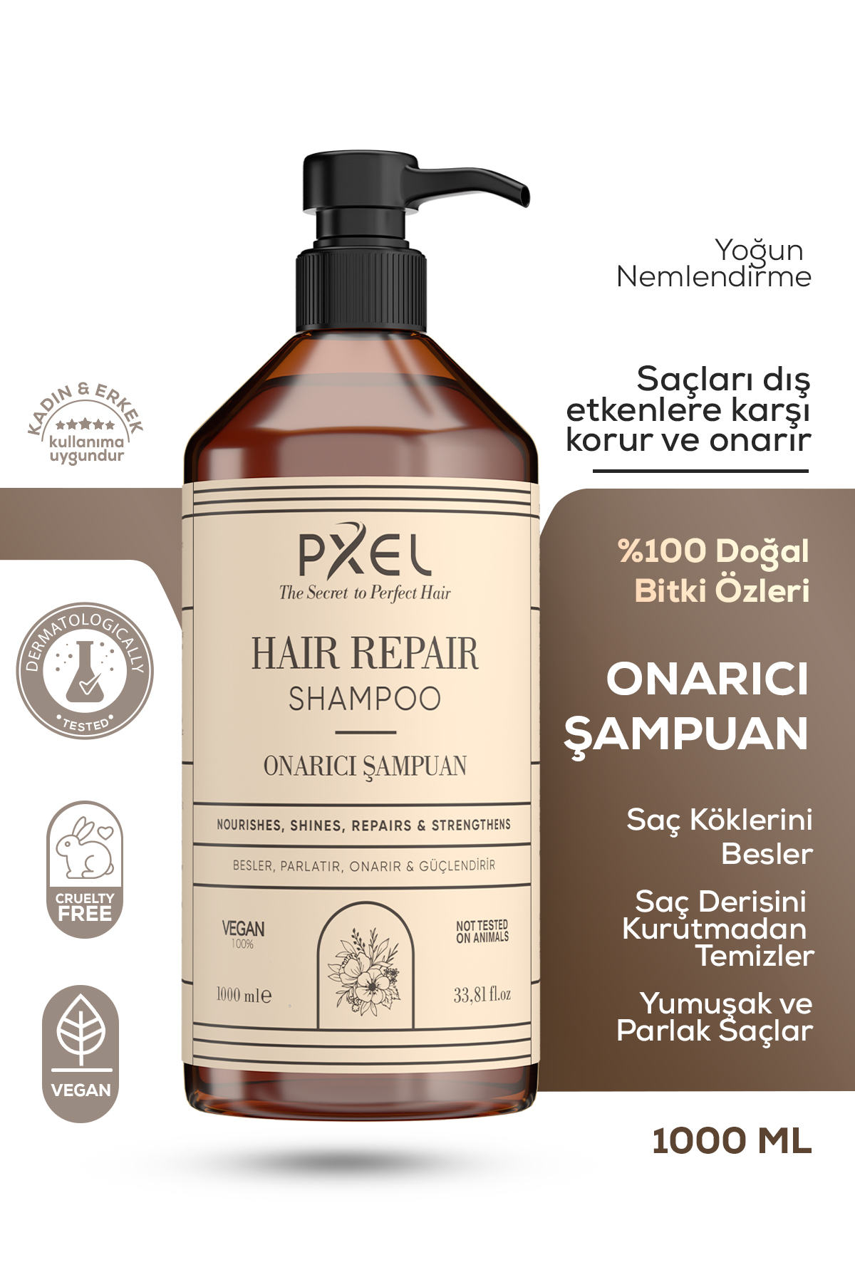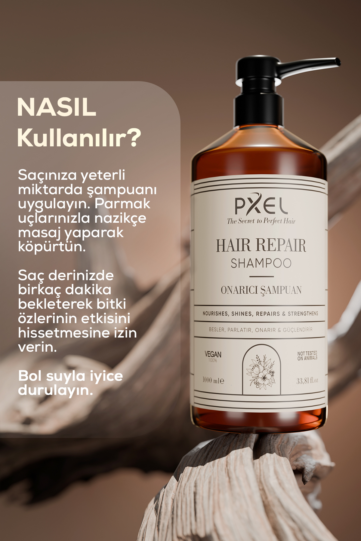 “text”: “PXEL Saç Onarıcı Şampuan özellikle yıpranmış, işlem görmüş (boyama, brezilya fönü, perma vb.), kuru, cansız ve zayıflamış saçlar için idealdir. Bitkisel proteinler ve panthenol sayesinde saçı güçlendirmeye ve onarmaya yardımcı olur.”